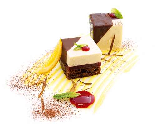 Dominostein "Sander-Style" aus Marzipanmousse mit Vanille und Zimt, mit einer Orangen-Preiselbeer-Schicht, auf saftigem Lebkuchenbiskuit, 4 x 4 cm.