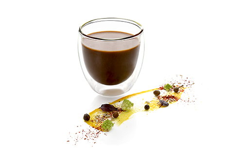 Dunkle Bratensauce fein püriert abgerundet mit Rosmarin und Liebstöckel.