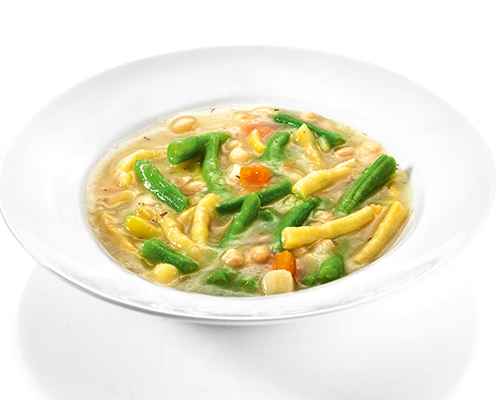 Eintopf von dreierlei Bohnen mit Rauchfleisch, Kartoffeln und Karottenwürfeln.