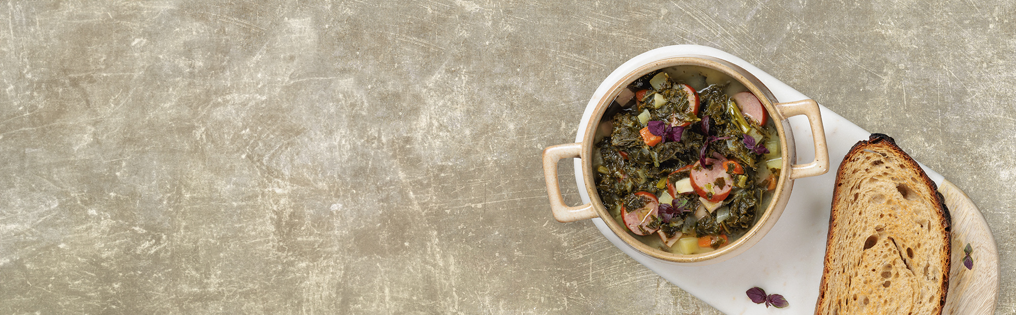 Grünkohleintopf mit Krakauer, Kassler und Kartoffel-, Kürbis- und Karottenwürfeln.