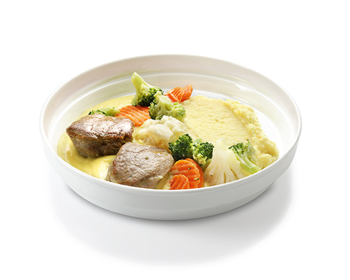 Schweinemedaillons in Sauce Hollandaise dazu Kaisergemüse und Kartoffelpüree.