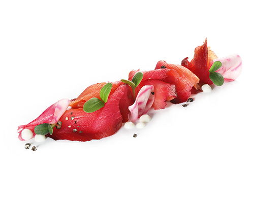 Superior Rote-Bete-Räucherlachs Rohware aus Norwegen, kalt geräuchert, geschnitten, mit Haut.