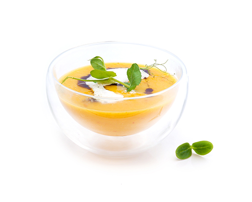 Vegane Kürbiscremesuppe mit Kokosmilch und Orangensaft, verfeinert mit Curry.